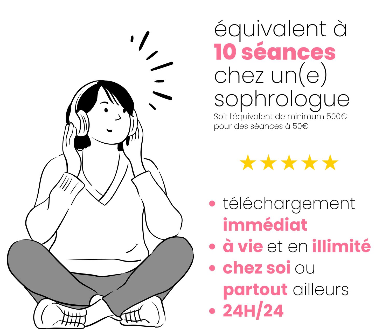 10 séances audios dédiées à la gestion de l'angoisse guidées par une sophrologue professionnelle, de 3 à 20 minutes, à télécharger en mp3, accessibles à vie, en tout temps et en tout lieu.